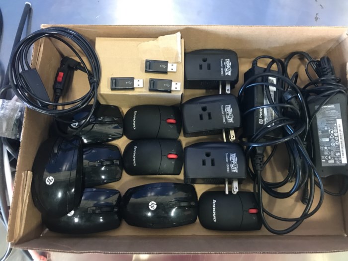 Lot includes: Wireless Mouses, Battery pack, AC Adapters, and more.