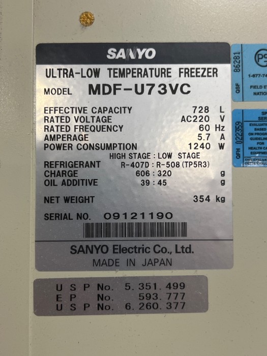 Sanyo Model: MDF-U73VC Ultra-Low Temperature Freezer