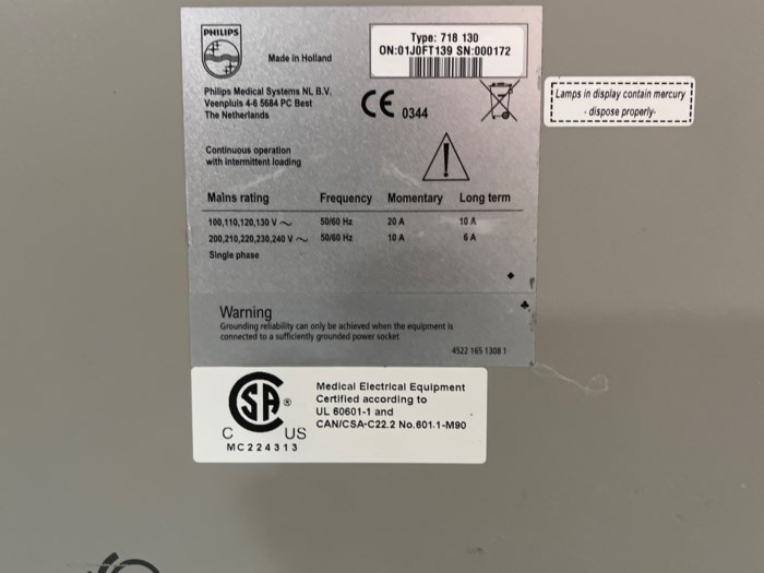 System Specifications: System (Philips Medical Systems) - Type: 718 130 - ON: 01J0FT139 - S/N: 000172