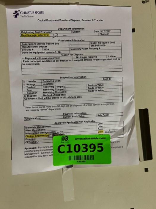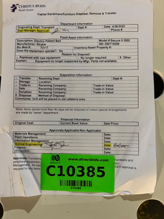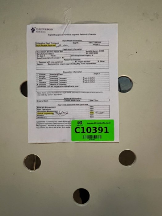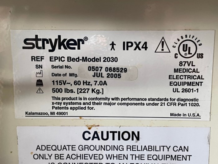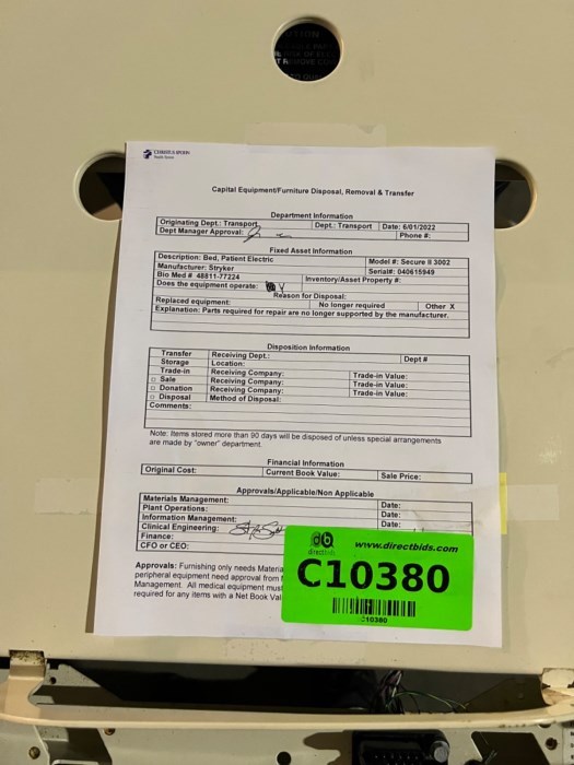 Stryker Hospital Beds (Lot of 12) Includes: - (1) Stryker Epic II Model: 2030 Hospital Bed (C10359) - (1) Stryker Hospital Bed Model#3002 (C10379) - (1) Stryker Hospital Bed Model#3002 (C10380) - (1) Stryker Hospital Bed Model#3002 (C10385) - (1) Stryker Hospital Bed Model Secure 2 (C10386) - (1) Stryker Hospital Bed Model#3002 (C10391) - (1) Stryker Secure 3002 Hospital Bed (C10392) - (1) Stryker Hospital Bed Model#3002 (C10395) - (1) Stryker Hospital Bed Model•Secure 3000 (C10396) - (1) Stryker Secure 3002 Hospital Bed (C10397) - (1) Stryker Secure 3002 Hospital Bed (C10398) - (1) Stryker Secure 3002 Hospital Bed (C10408)