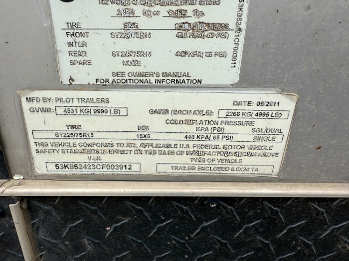 2012 Pilot 24 ft T/A Enclosed Trailer 9990 lb GVWR, Torsion Axle, Side Door