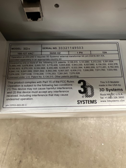 3D Systems ProJet 3510 HD Plus 3D Printer - Unable to test at time of auction, incompatible power source