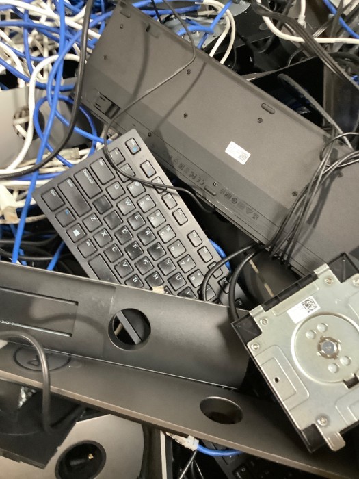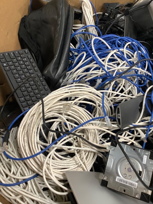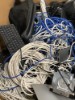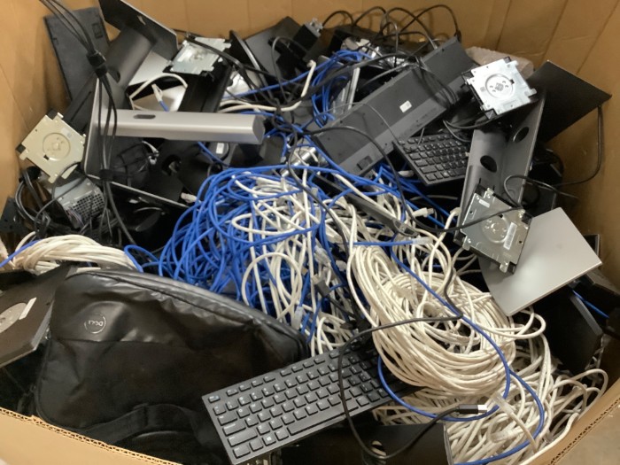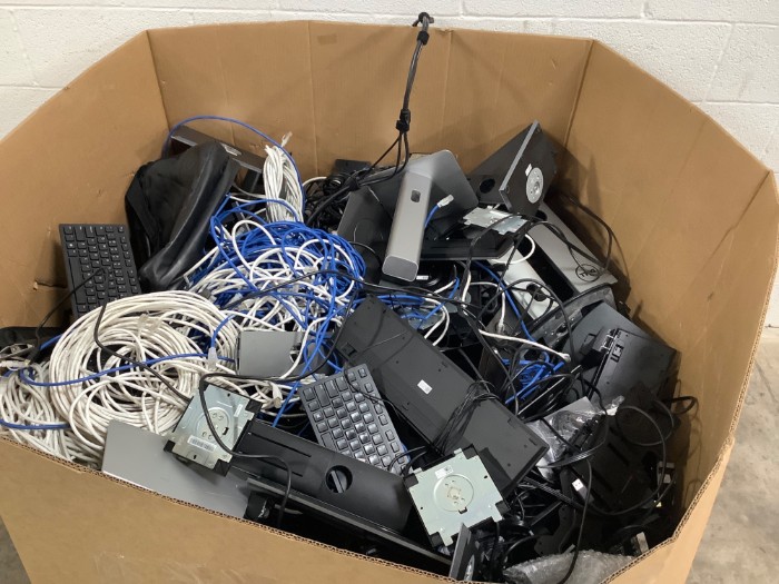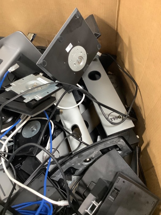 Box of Assorted Electronics Surplus Dell Monitor Stands Cables Chargers, Cables and more