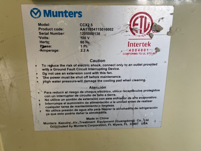 Munters Portable AC - Manufactured by: Munters - Model: CCX2.5 - Expect 11-23 degree temperature drop in 600 sq room
