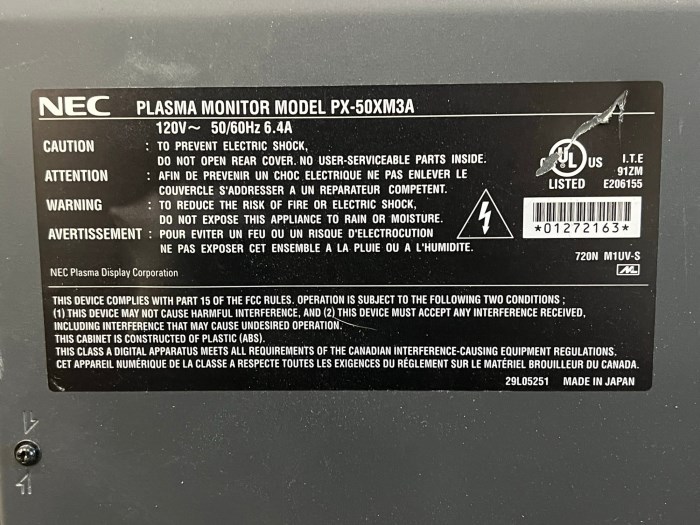NEC Model: PX-50XM3A Plasma Monitor - Powered on at time of auction, however was not able to test. Does not include power cord pictured.