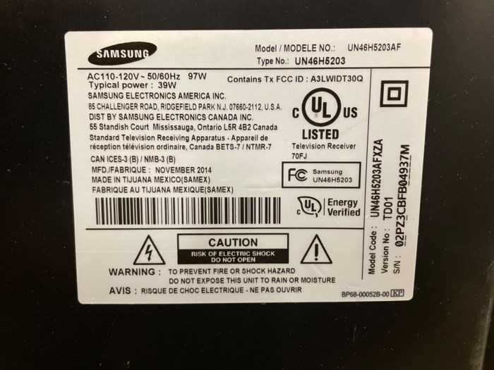 Samsung UN46H5203AF TV (Powered on at time of auction)