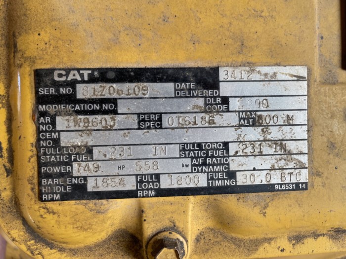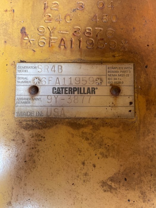 Caterpillar Model: SR4B Industrial Generator General: - MODEL. SR4B - SERIAL NUMBER. 6FA11959 - ARRANGEMENT NUMBER. 9Y-3877 - MADE IN. USA Equipped with: ** CAT Motor: - Ser. No. 81Z06109 - 3412 - DLR CODE. E200 - AR NO. 1W9603 - PERF SPEC. 0I6186 - MAX ALT. 800 M - FULL LOAD STATIC FUEL. 231 IN - FULL TORQ STATIC FUEL. 231 IN - POWER. 749 HP 558kw - BARE ENG. HIIDLE RPM. 1854 - FULL LOAD RON. 1800 - FUEL TIMING 30,0 BTC
