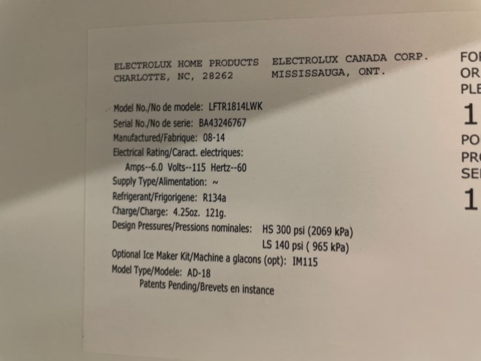 Frigidaire Model LFTR1814LWK Upright Combo Fridge/Freezer