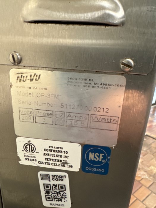 Nu-Vu Model: OP-3FM* Commercial Kitchen Oven