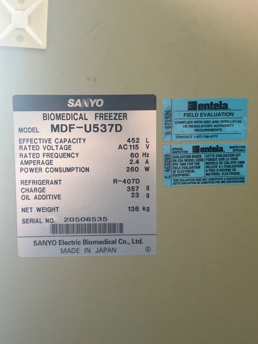 Sanyo Biomedical Freezer Model: MDF-U537D