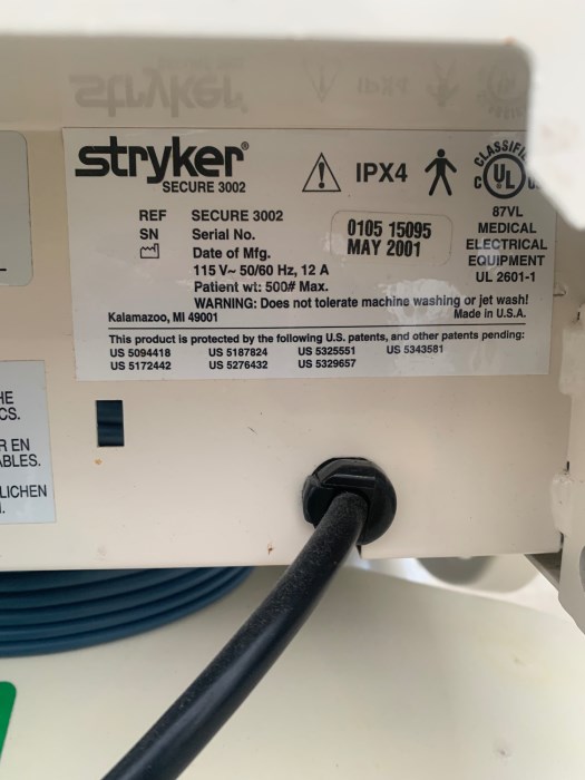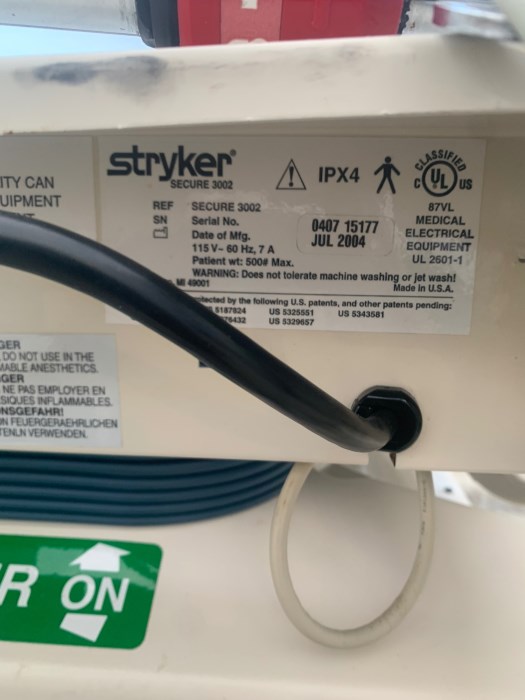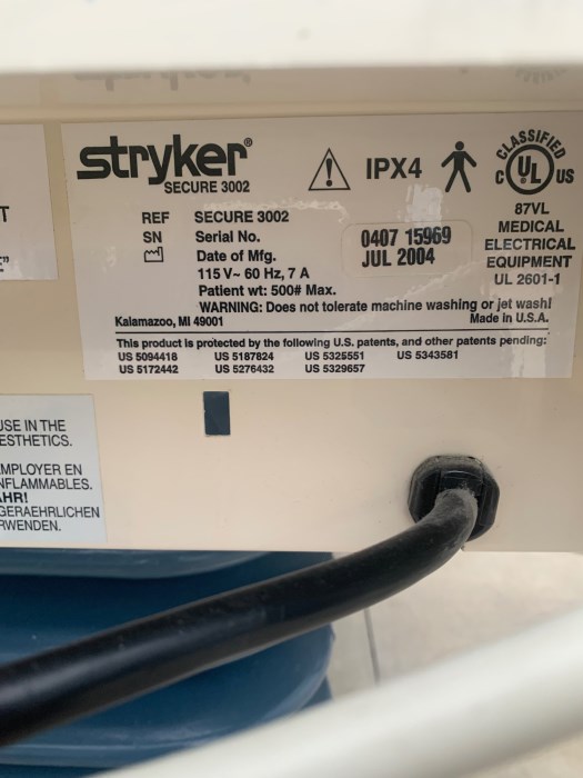 Stryker 3002 Date Mfg. May 2001, Jul 2004, and Jul 2004