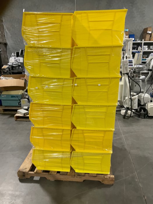 Assorted Bins. Miner wear and tear from general use. SOLD AS IS