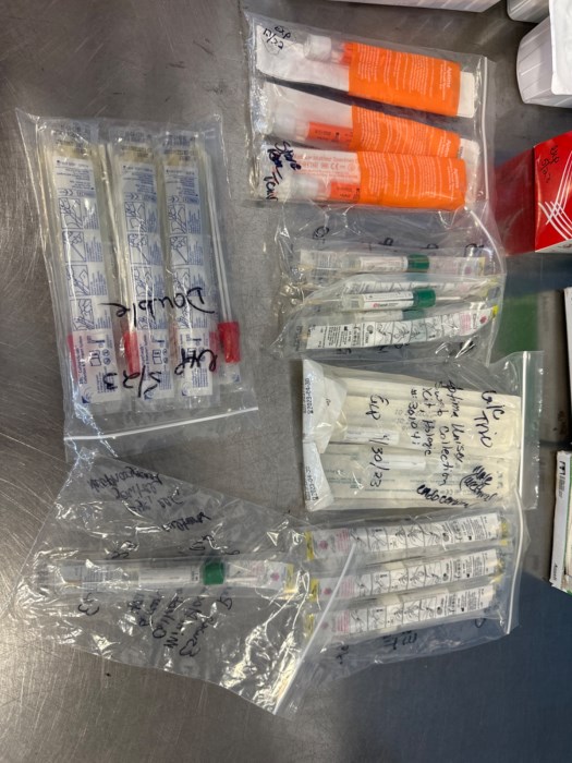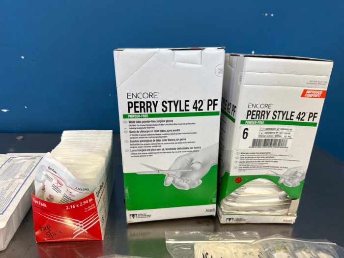 Assorted Medical items including Reusable BP Cuff + Small Vein Infusion Set Box + Urethral Catheterization Tray + Eye Pads + Perry Style 42 PF