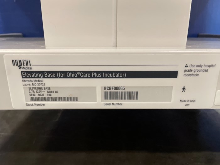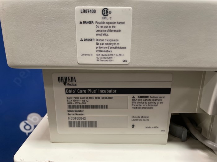 Ohmeda Ohio Care Plus Incubator w/ Elevating Base Care Plus Access Mod 4000 Incubator Serial #: HCDF0043 Ohmeda Ohio Elevating Base Serial #: HCBF00065 - Powered on at time of auction and elevating base was operational