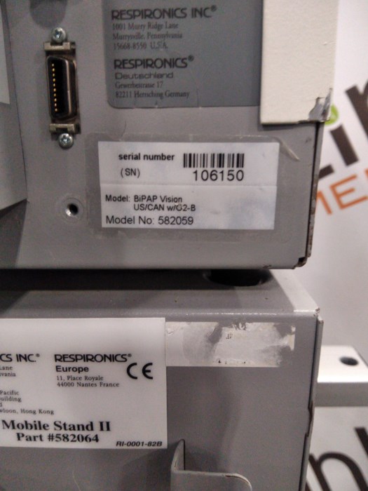 Material Desc.: BiPAP Vision / OEM: Respironics / Modality: Respiratory / Accessories: Cart / Serial #: 106150 / Cosmetic Condition: Good / Functional Condition: Untested / Package Type: Freight / Weight: 64