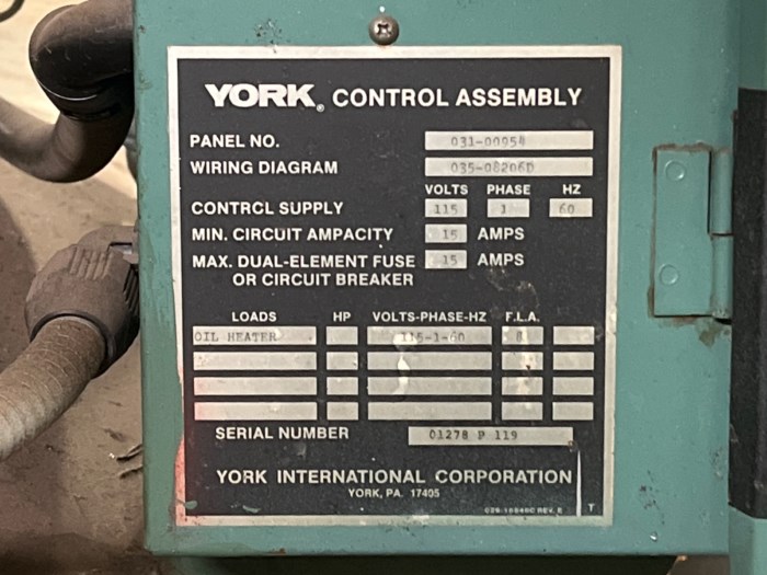 General Specifications: - Model: YT L3 L3 E2-CTETM - Refrig. DWP, PSIG: Cooler: 15 - CLG Cond. 15 - H.R. Cond. - - Liquid DWP, PSIG: Cooler: 150 - CLG Cond. 150 - H.R. Cond. - - No. Of Passes: Cooler: 3 - CLG Cond: 2 - H.R. Cond. - - Shell Test Press., PSIG: 30 - Refrigerant Type (Removed at time of auction): 11